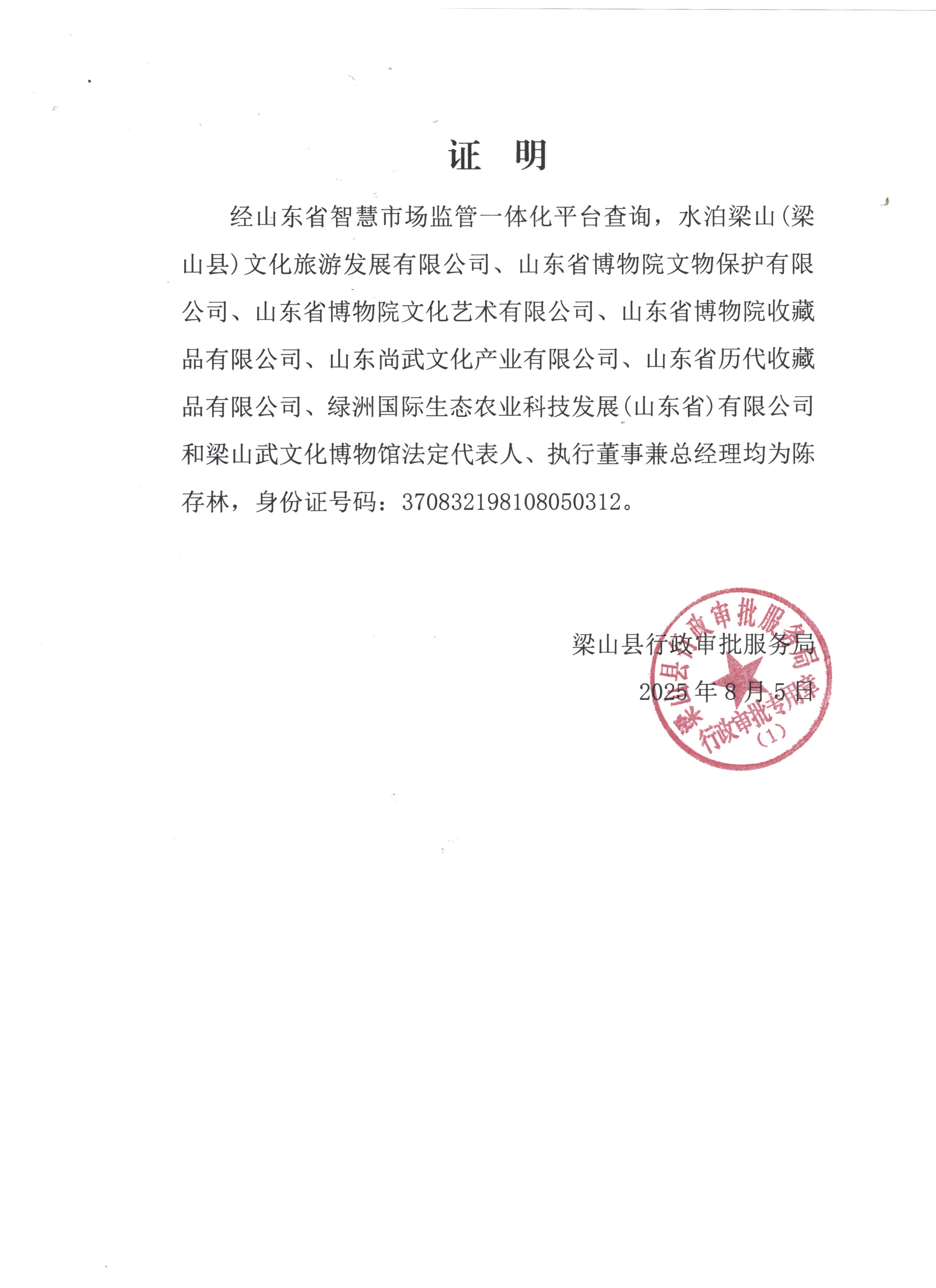在陈存林先生主持的 山东省历代收藏品有限公司,陈存林先生以其独到的眼光与深厚的收藏底蕴,引领公司在收藏品鉴定、交易、展览等方面取得了卓越成就。他坚持诚信为本、品质至上的原则,为收藏界树立了良好的典范,同时也为众多收藏爱好者提供了专业的鉴定与交易服务 。2022年3月,山东省历代收藏品有限公司经梁山县文化和旅游局批准,成立了梁山县文物总店 (抖音号: 62801039123),为梁山县丰富的文物资源提供了一个集中展示的平台,让更多人有机会了解和欣赏梁山地区的历史文化。